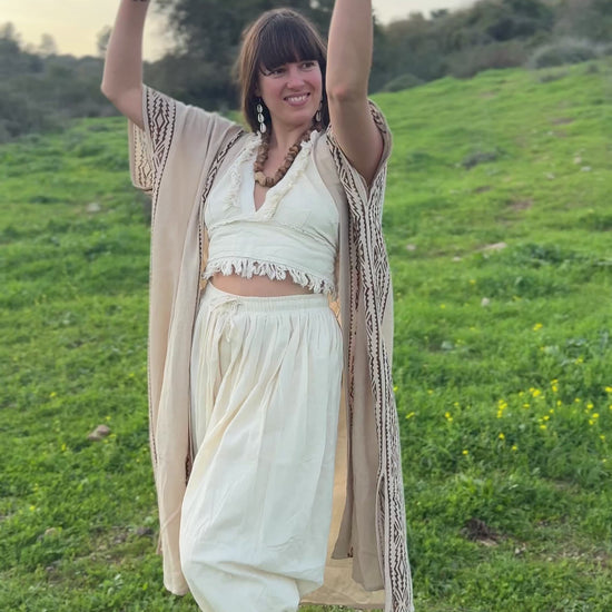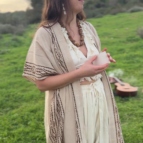 A flowing kimono made from soft, natural cotton and adorned with hand block prints. Lightweight, earthy, and effortlessly elegant- perfect for layering with intention and soul.