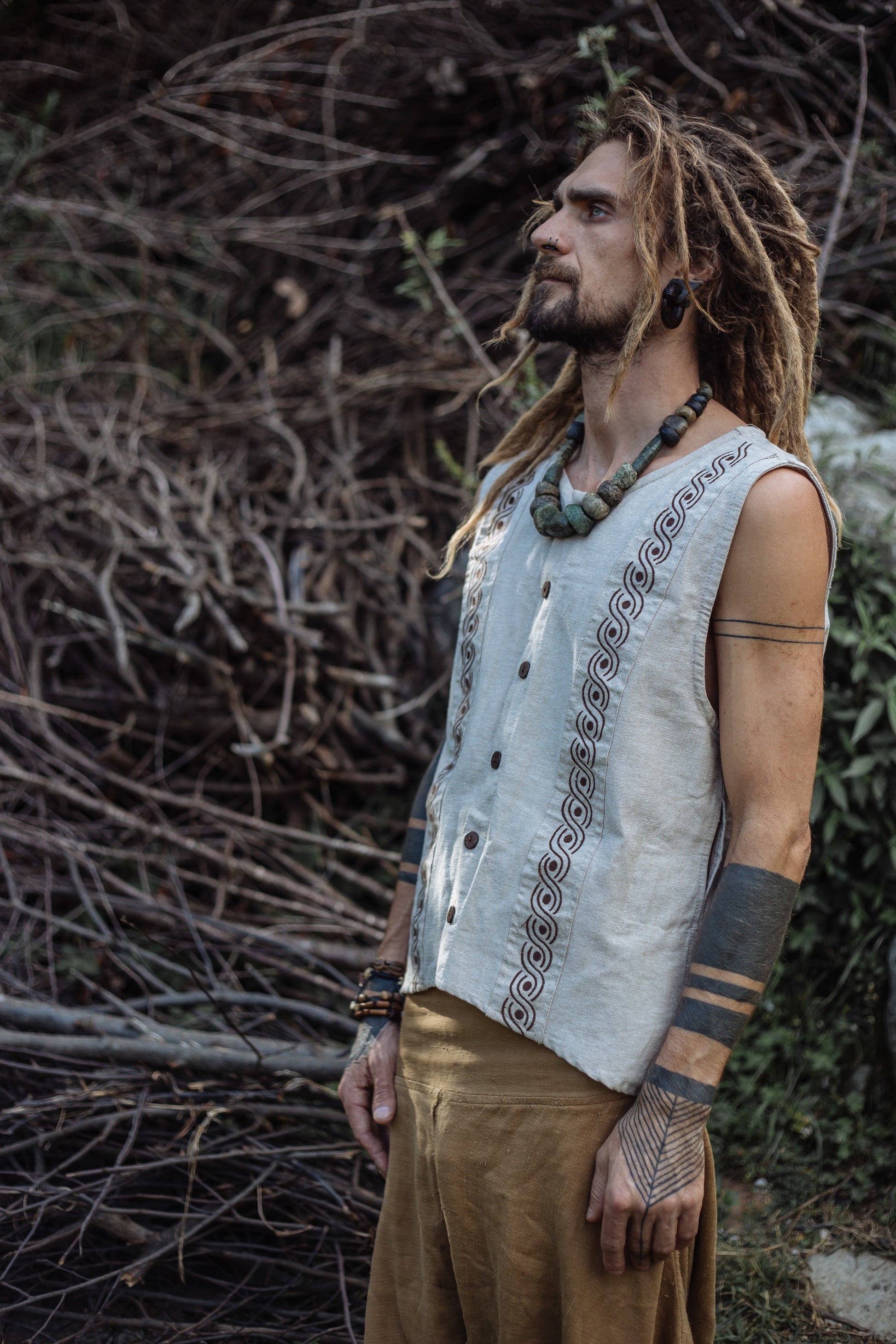 ❂ Men's Vest with pockets and Kundalini Snake Embroidery ~ Tribal Embroidery Design ~ made of Nepali Cotton ❂