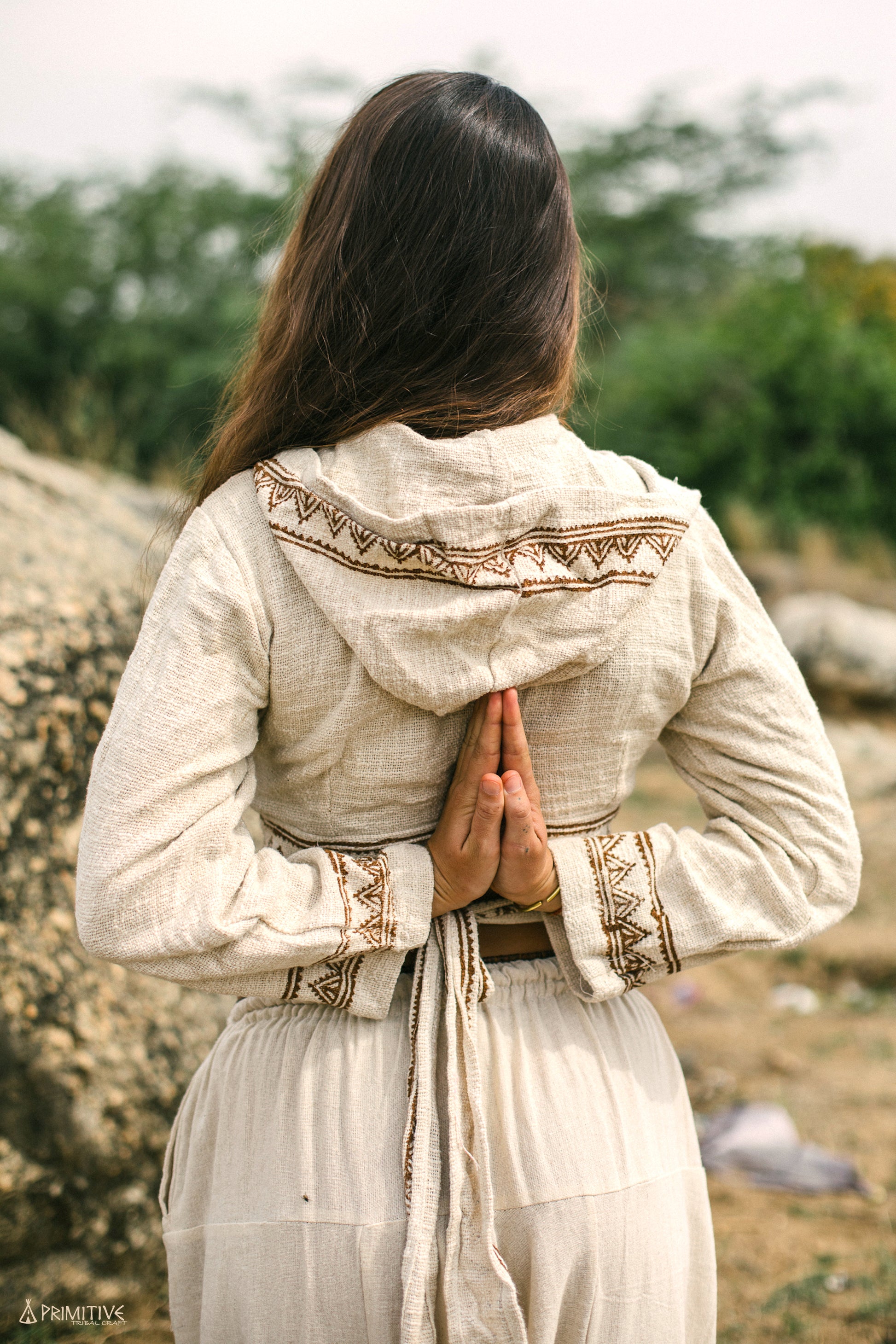 ❂ beautiful wrap jacket with long sleeves, a large hoodie & little block print details all around ~ add a little touch of warmth and magic to your outfit ~ wraps around the belly ❂